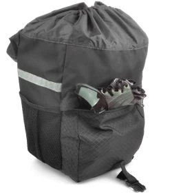 A pair of large pannier bags. Drawstring closure with elasticized lid and buckle fastening. Large front pocket and 2 mesh side pockets, it allows users to store many items.