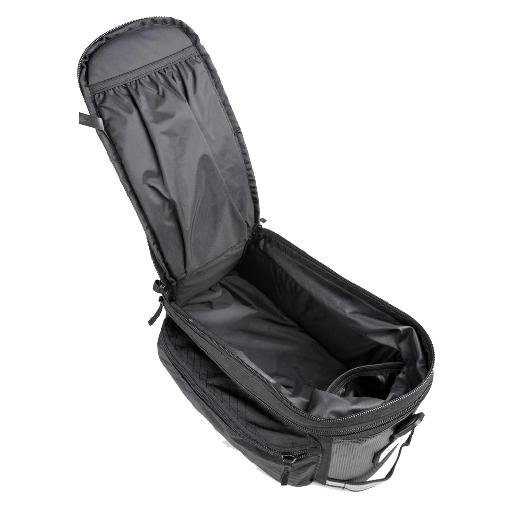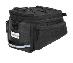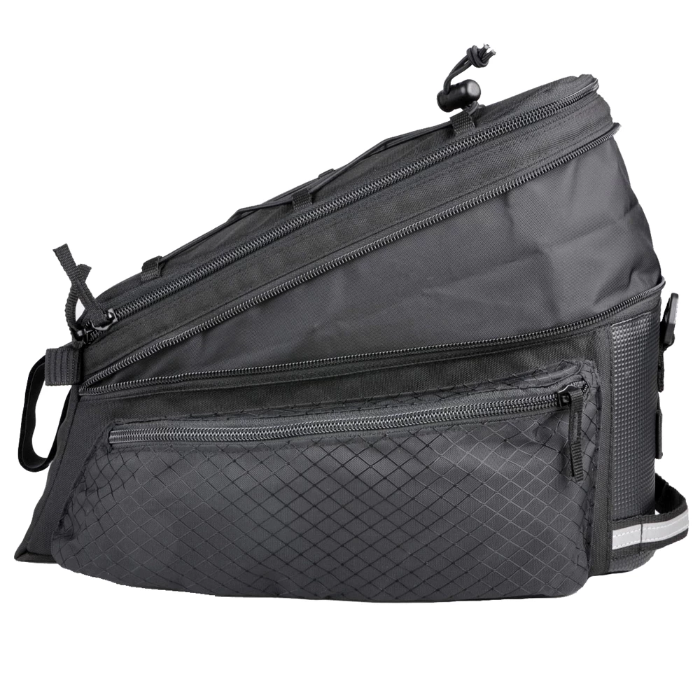 Rack Top bag with rigid foam-lined walls and zipped extendable top section. Internal pouch and key hook. 2 large zipped side pockets and bungee cord on top. Carry handle and detachable shoulder strap.
