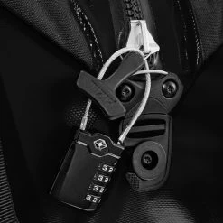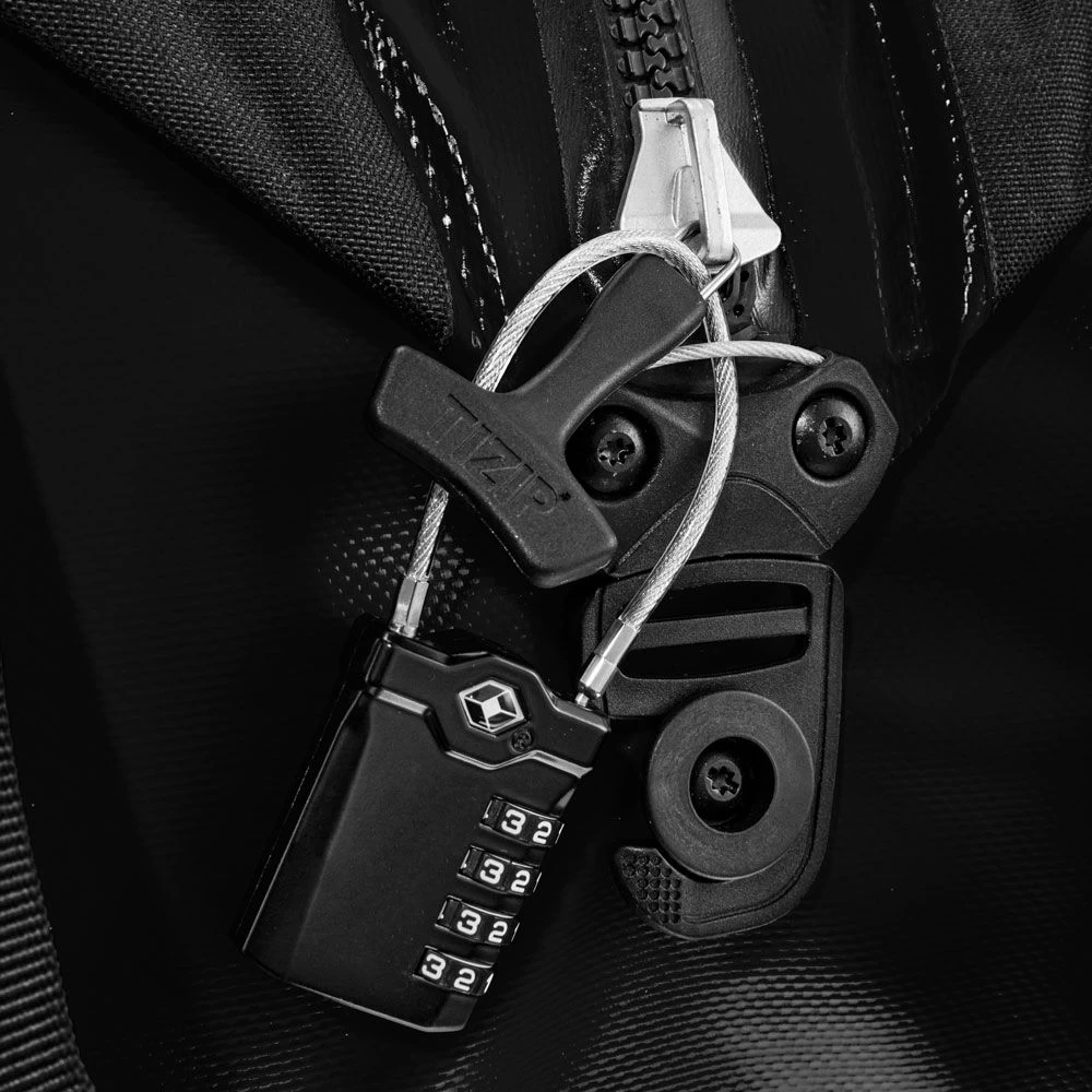 - The bag can be locked by using a padlock and inserting it through the wire loop provided at end of the zipper (lock not included)