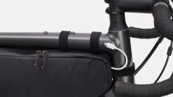 Two-way zippered frame bag with a large opening for easy access to biking essentials. It has a sturdy, reliable seven-point Velcro attachment, and the pack is made from durable Vinylon with a recycled nylon lining and foam-padded sides that help maintain its shape. Inside mesh pockets keep track of smaller items. The seams are not taped, but the lining is waterproof. Part of the Specialized/Fjällräven series for urban rides and bikepacking adventures.