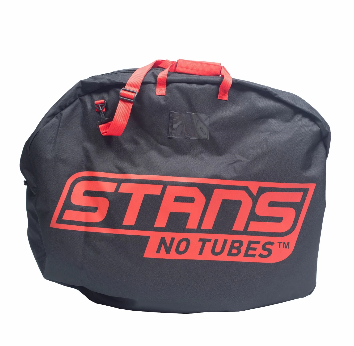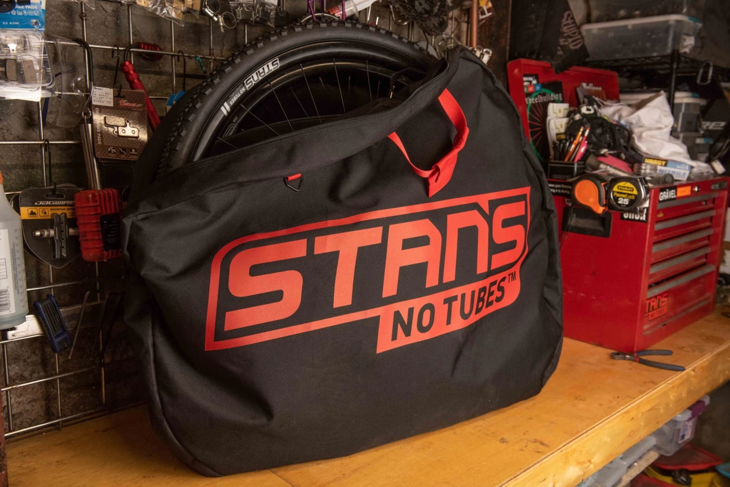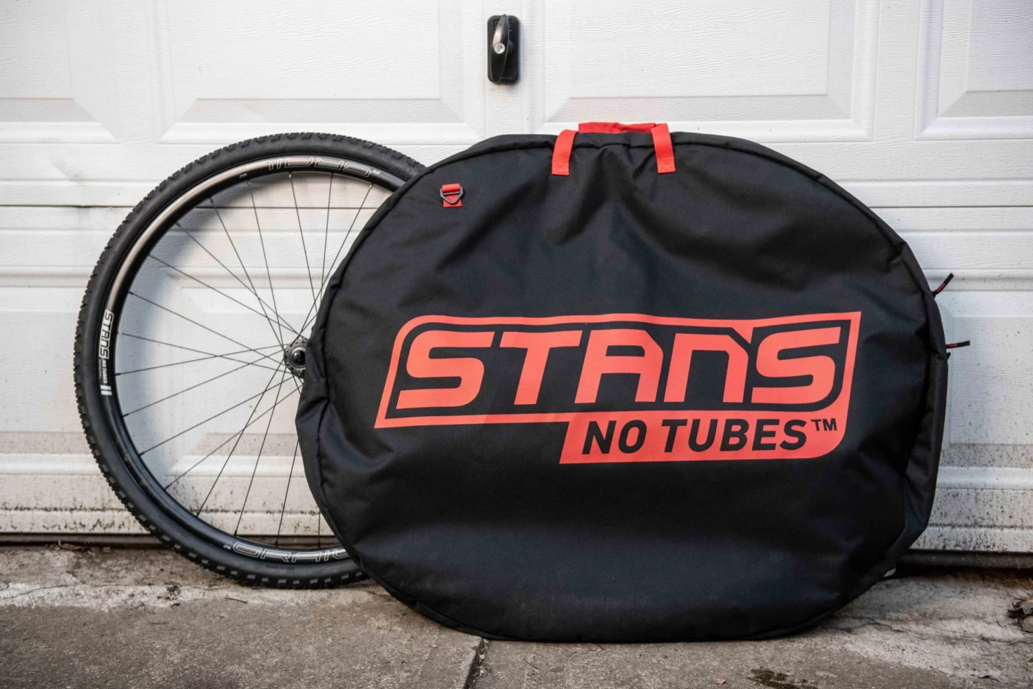 Stans NoTubes deluxe padded double wheel bag with adjustable shoulder strap, carry handle, skewer/parts pocket and external identification sleeve. Fits two 29″ mountain wheels with 2.4″ tires! Perfect for travel or getting your spare wheels to the pit.