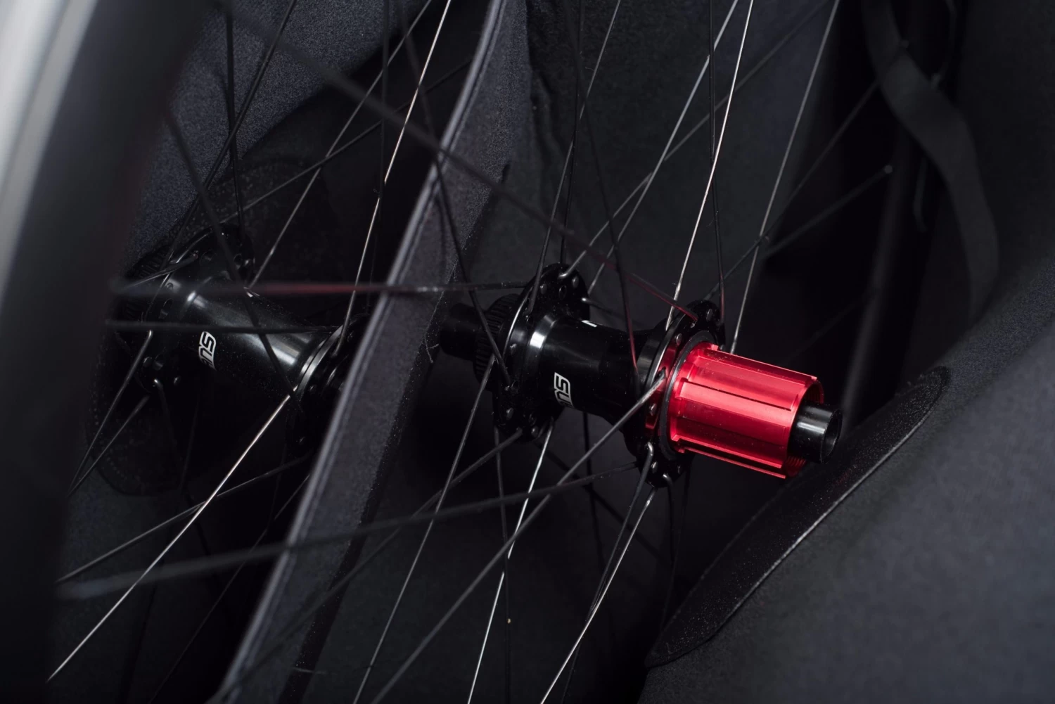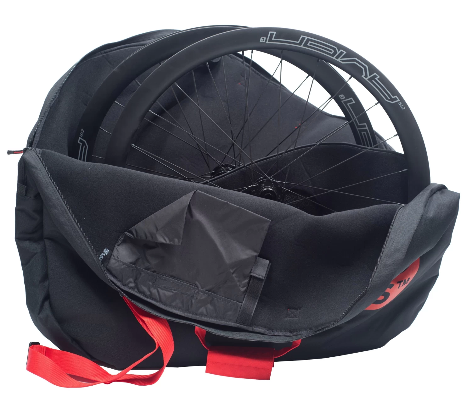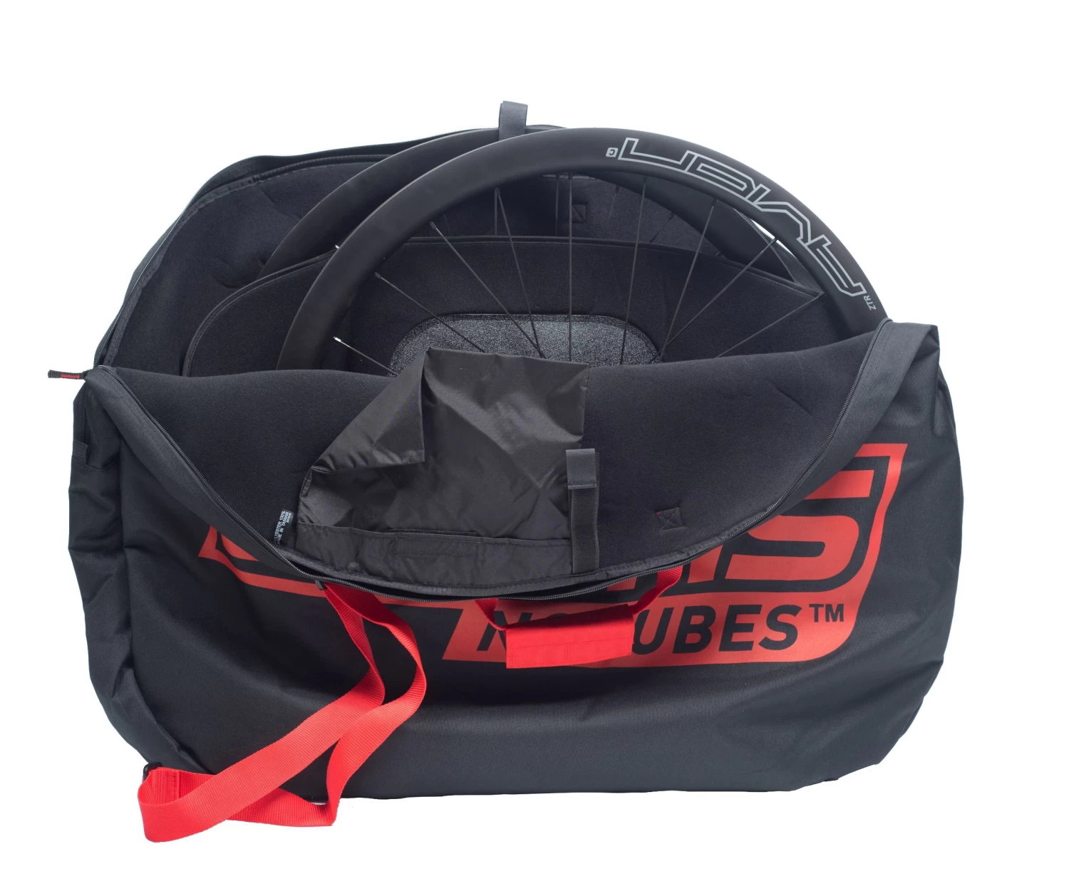 Stans NoTubes deluxe padded double wheel bag with adjustable shoulder strap, carry handle, skewer/parts pocket and external identification sleeve. Fits two 29″ mountain wheels with 2.4″ tires! Perfect for travel or getting your spare wheels to the pit.
