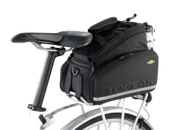 Divided main compartment and side panels expand for extra storage capacity. Rear water bottle holder lets you carry more water on extended trips. Attaches with integrated straps. Pannier deployment requires a beam rack with side frames attached or a traditional rack with struts to prevent panniers from contacting rear wheel.