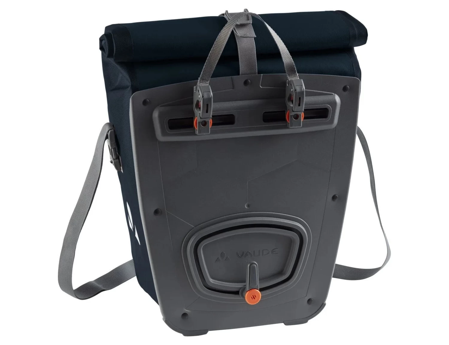 It can be locked directly to the QMR hook with a bicycle lock. With reflective elements. Contents: 1 Bag that can be attached either on the left or right of the gear rack. Can be supplemented by these practical accessory bags: Sort your Back and Addita Bag. The VAUDE Green Shape label stands for environmentally-friendly, functional products made from sustainable materials.