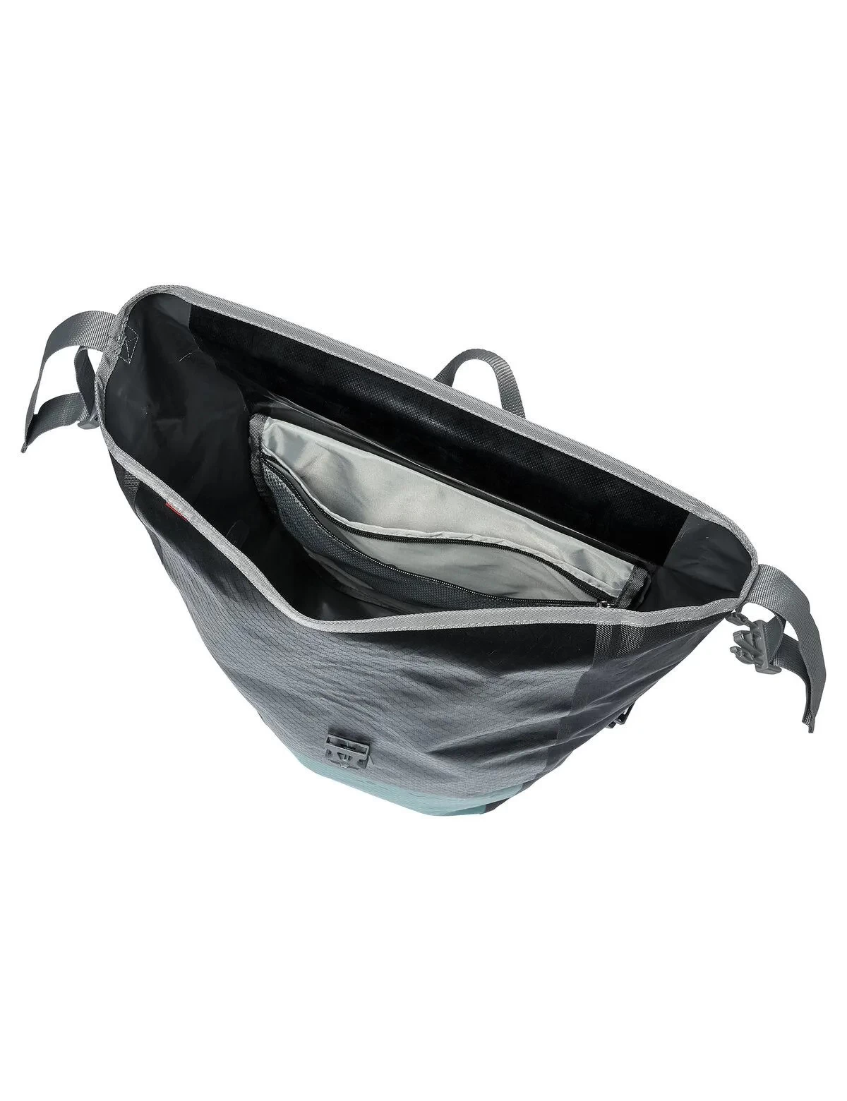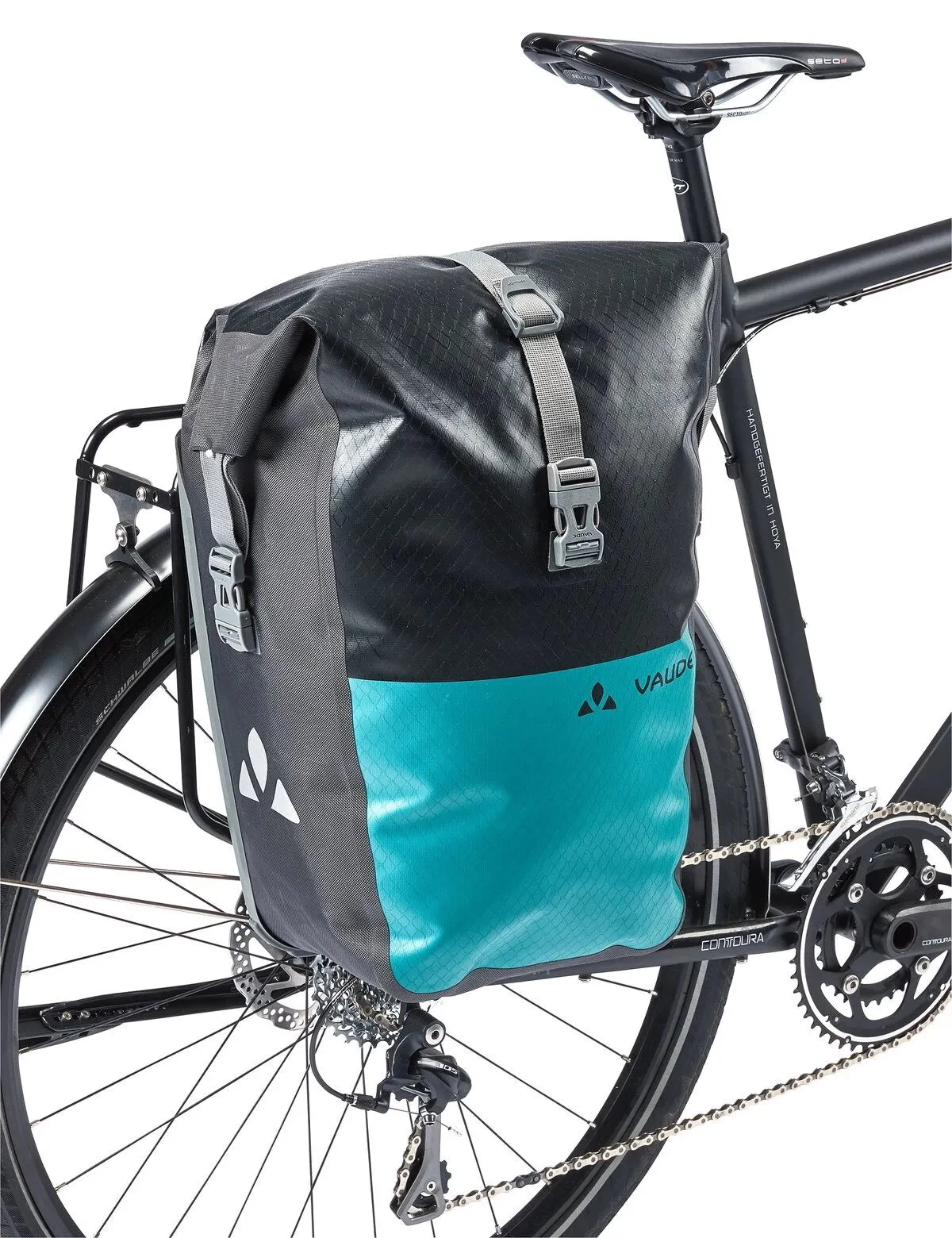 With the Aqua Bag Color Single, you’ll be ready for the big, wide world! The waterproof rear wheel bag with understated colour-block styling is made of robust, PVC-free canvas with climate-neutral manufacturing at the German VAUDE headquarters near Lake Constance. It can be individually adjusted to the size you want with its roll closure and is absolutely watertight. A simple inner pocket provides a clear overview. The bike bag can be attached to the rear gear rack with the QMR 2.0 system and its stable back plate on the right or left, is easily adjustable and is a breeze to detach when you want to take it with you.